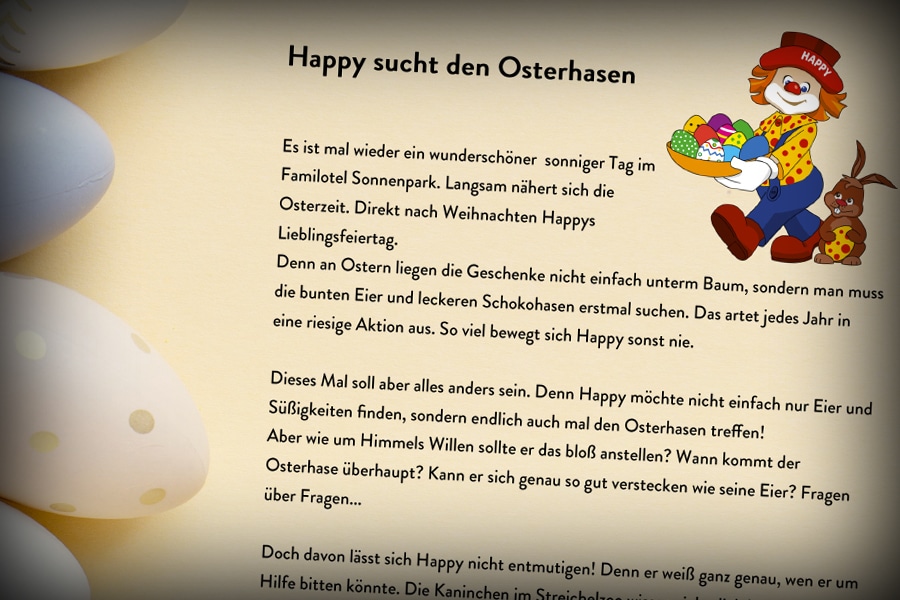 Passend zur aktuellen Zeit dreht es sich um Ostern. Unser Familotel Maskottchen möchte nämlich endlich mal den Osterhasen bei der Arbeit sehen. Aber wie soll er das nur anstellen? Er weiß doch gar nicht wo der Osterhase gerade ist, geschweige-denn wie er genau aussieht.