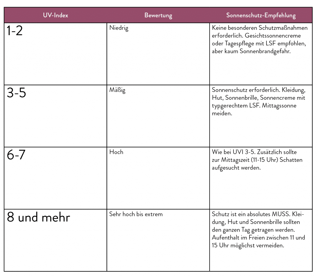 Der UV-Index beschreibt die Intensität der UV-Strahlung und wie schnell ein Sonnenbrand bei ungeschützter Haut auftreten kann. Er wird oft übersehen, ist aber ein wichtiges Maß und in nahezu jeder Wetter-App Standard. So hilft er euch schnell und einfach das aktuelle Risiko einzuschätzen und eure Kinder zu schützen. Die folgende Tabelle bietet euch eine klare und schnell zu erfassende Übersicht über die notwendigen Schutzmaßnahmen, basierend auf der aktuellen UV-Intensität. ⁴
