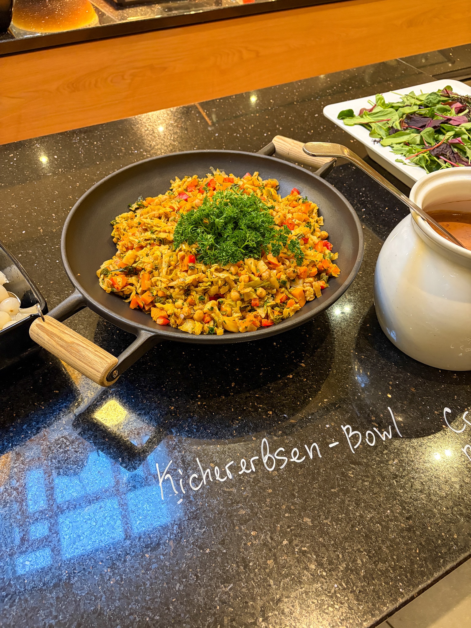 Das Abendbuffet ist ein echtes Highlight. Die veganen Speisen sind deutlich gekennzeichnet und vorher schon in der Web-App sichtbar. Es gibt zum Beispiel Avocado Steakly, Bowls mit Ebly oder Kichererbsen, Kürbis-Falafel, vegane Burger oder orientalischen Couscous. Suppen, Gemüse und Quinoa runden das kulinarische Angebot ab.