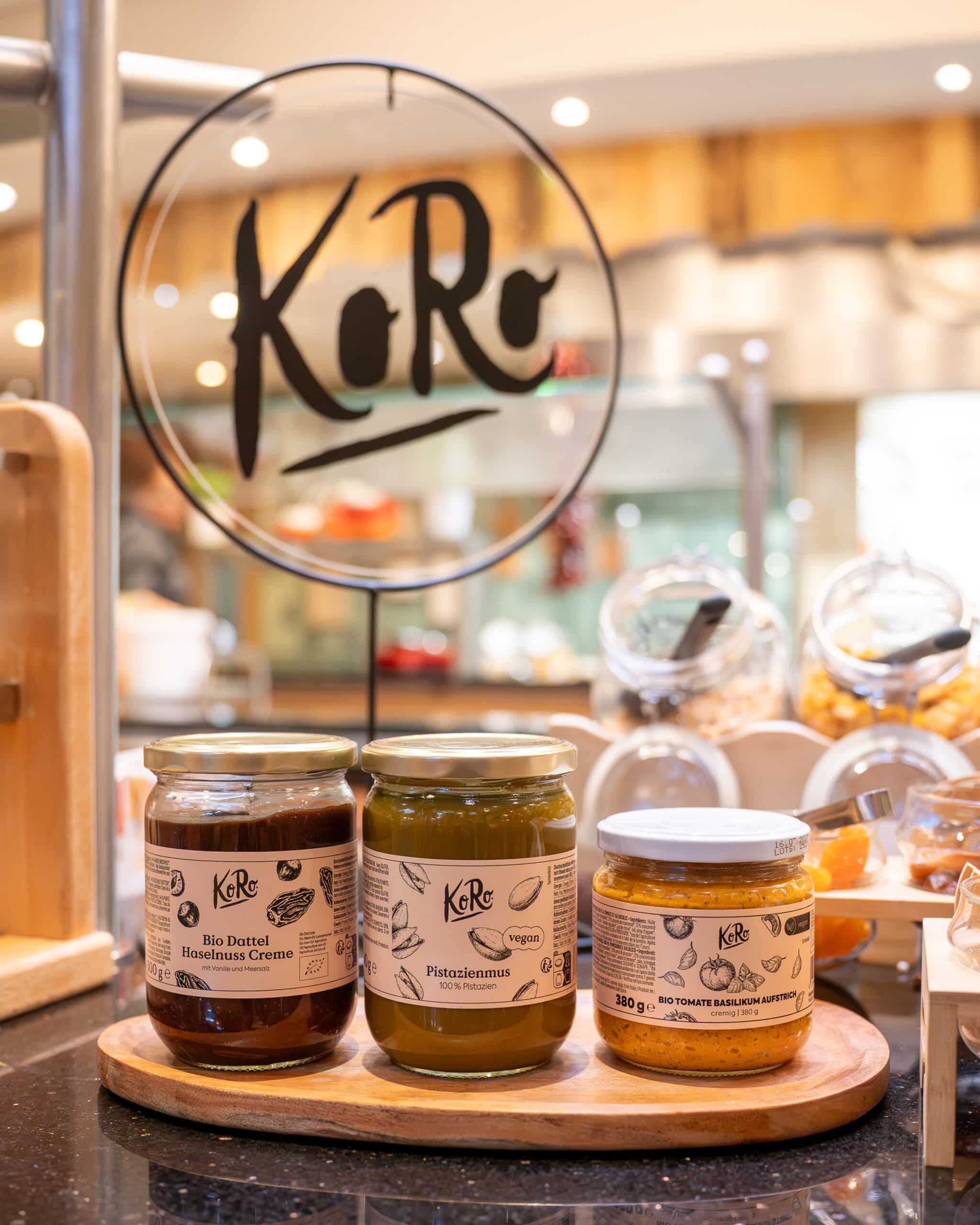 Der Morgen beginnt bunt. Frisches Obst, knackiges Gemüse, Müslis, Granola und pflanzliche Joghurts stehen bereit. Dazu finden Sie Aufstriche, vegane Wurst- und Käsealternativen und hochwertige Produkte von KoRo. Natürlich gibt es auch Hafermilch für den ersten Kaffee des Tages.